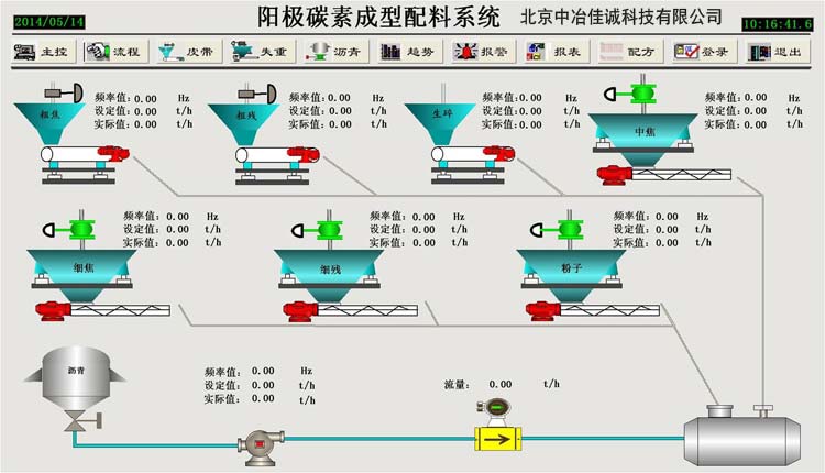 粗焦、中焦、生碎及粗残极采用皮带配料秤,细焦、细残、焦粉采用失重秤,液体沥青采用质量流量计或失重秤,配合工控机、智能仪表,组成阳极连续配料系统的最佳配置方案。具有配料精度高、运行稳定、工程施工及设备维护量小、保温系统少等优点。