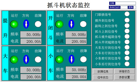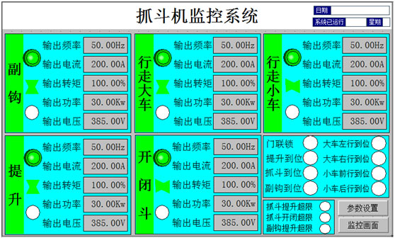 抓斗升降及开闭的控制先由操作台将运行控制信号给至PLC,再由PLC根据该两台电机的电流、转矩、速度等各参数进行综合判断,控制变频器给出最优的相对运行速度和力矩,确保不发生溜车、撒料等现场,司机在起斗时候不用观察是否完全闭合,系统会自动控制抓斗闭合越来越紧,实现抓斗的快速、准确、高效的半自动化运行,大大减轻操作工人的操作强度。